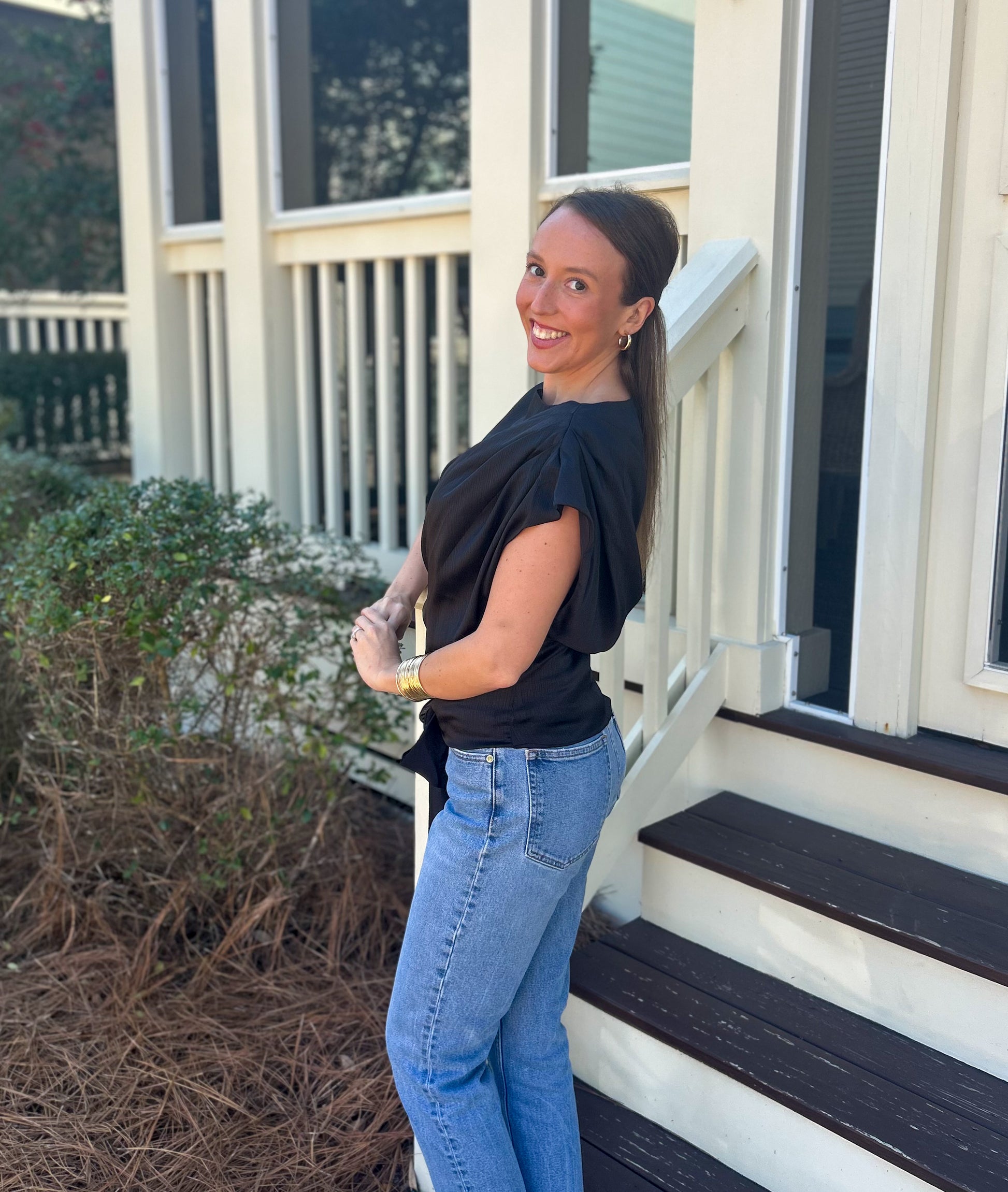 Boat Neck & Waist Tie Blouse-Black
